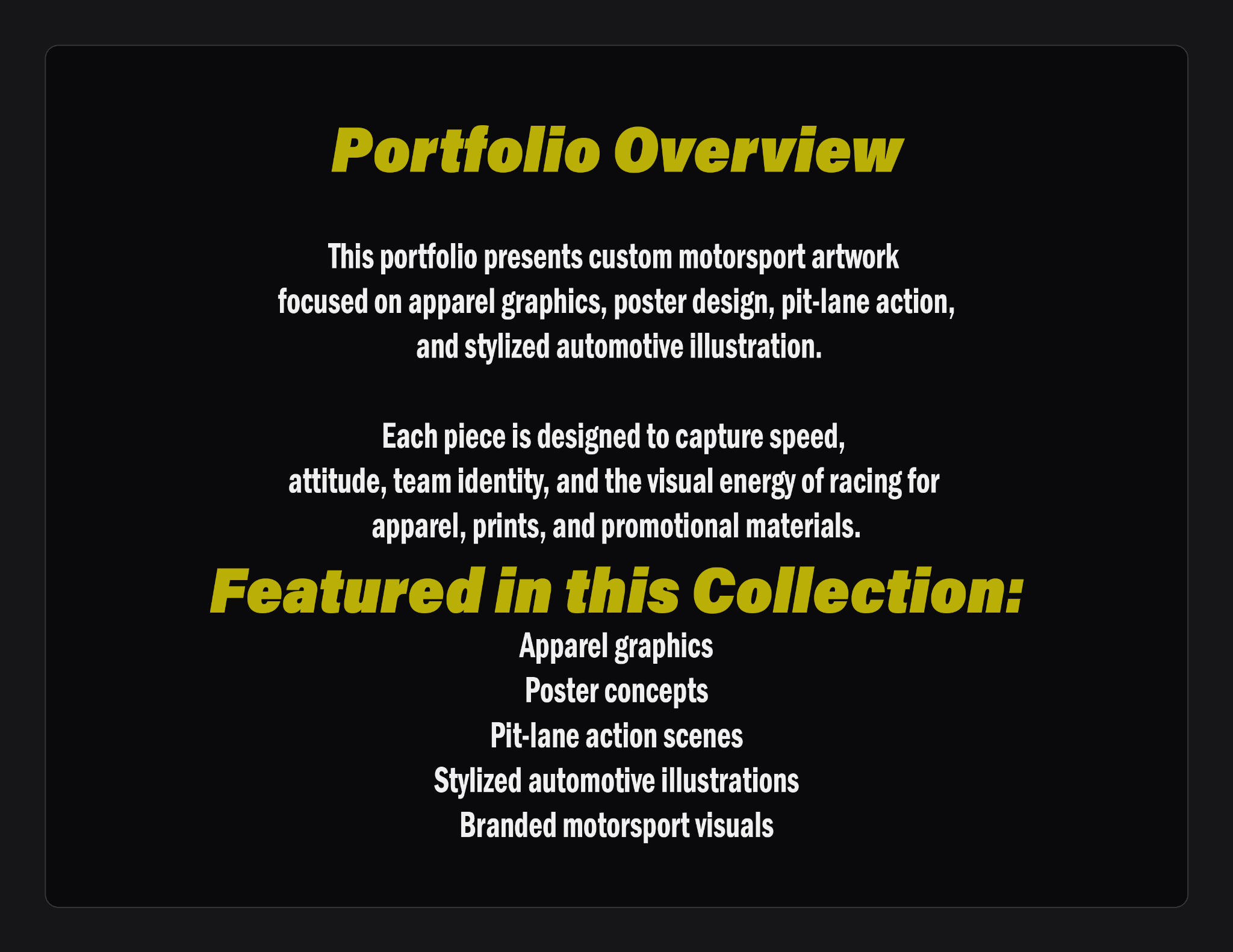 Each piece is developed to combine motorsport energy with strong visual storytelling, sponsor readability, team character, and premium presentation value.